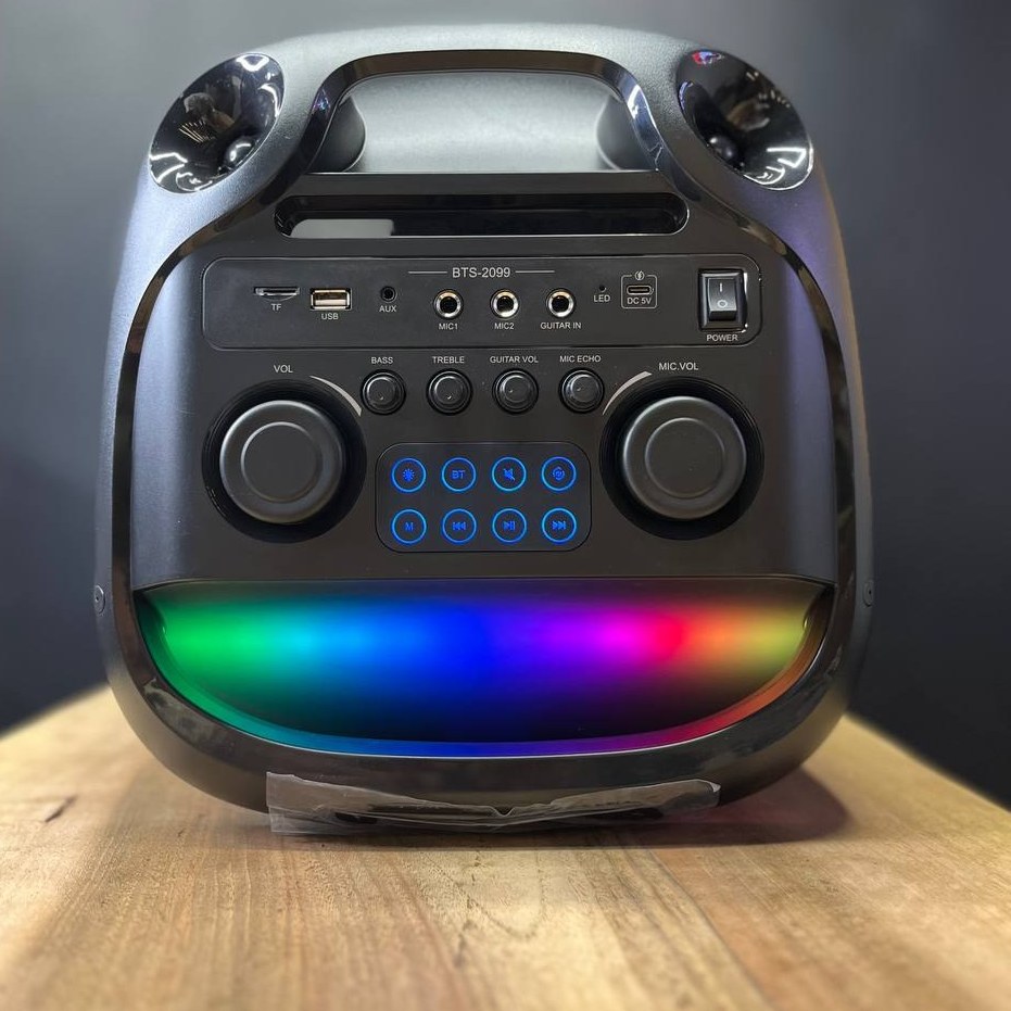 کلید پاور، دکمهی انتخاب منبع پخش، دکمههای کنترل محتوای در حال پخش، غلتک تنظیم صدا، غلتک تنظیم صدای میکروفون، دکمهی تنظیم نورپردازی، دکمهی تنظیم اکو، دکمهی تنظیم Bass، دکمهی تنظیم Treble